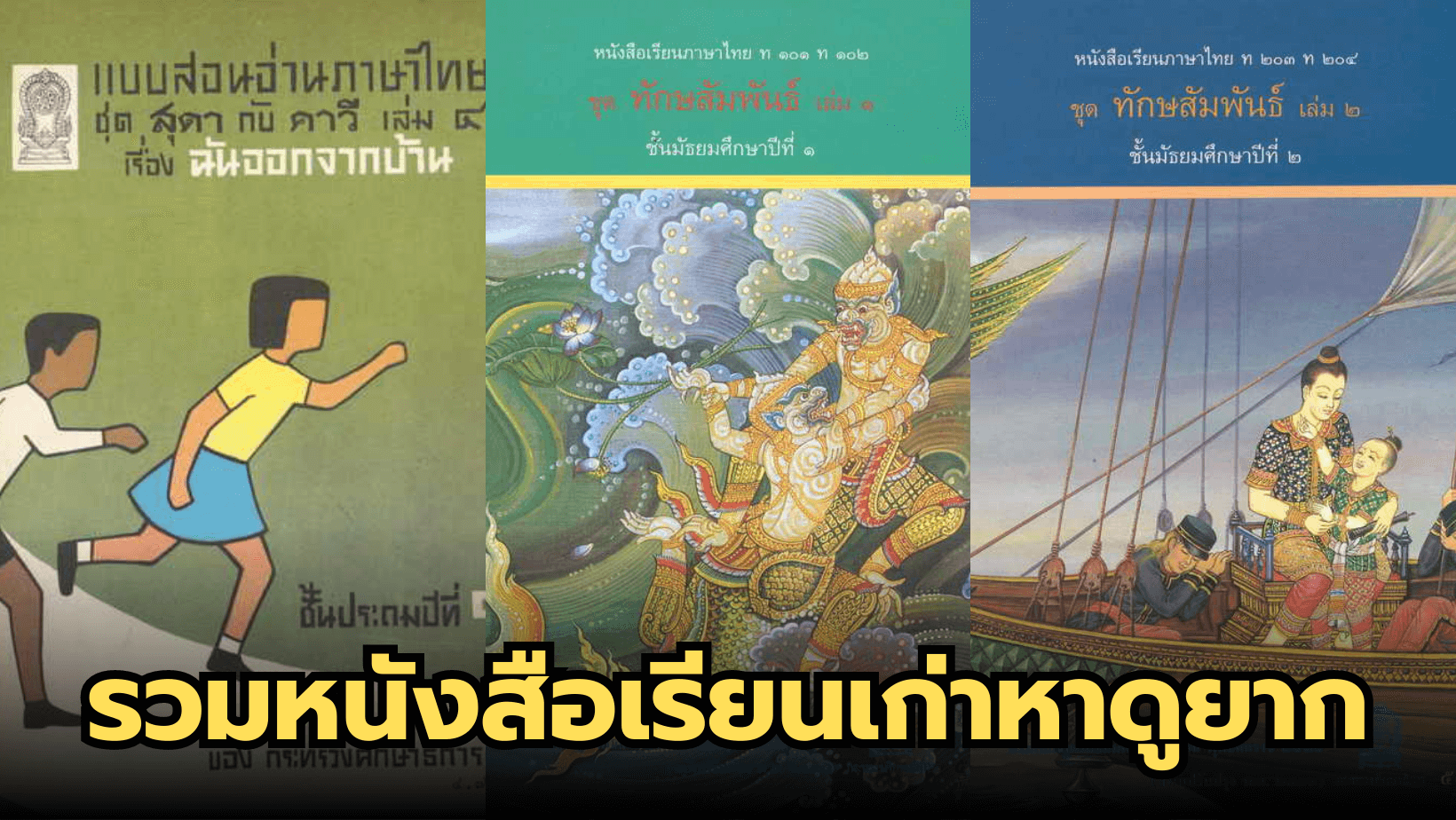 ที่คุ้นชินกันก็น่าจะเป็นหนังสือเรียน กพอ. สลน. สปช. หรือมานี มานะ ปิติชูใจ ประมาณช่วงเด็กยุค 90’s ได้เรียนกัน แต่หากย้อนกลับไปอีก หนังสือเรียนเหล่านั้นก็อาจจะไม่คุ้นหน้าคุ้นตาสักเท่าไร